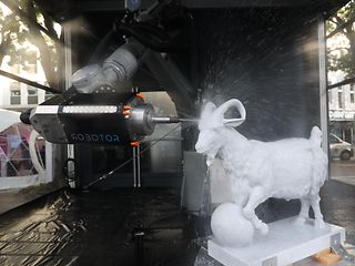 In addition to the crowd-pulling presentations, Digital X also featured a variety of digital solutions that visitors could try out for themselves. At the "Robotic Playground", robotic arms animated visitors to jump rope. Another robotic arm created large, colorful soap bubbles. And yet another chiseled out of white marble a meter-sized billy goat, mascot of 1. FC Köln.
