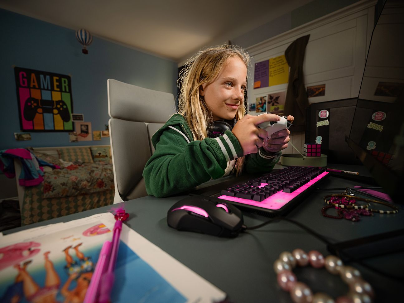 A child sits at a desk and plays computer games. Keyboard and mouse glow in magenta.