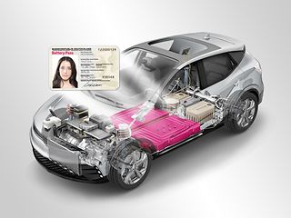 Transparent electric car with batteries in magenta. Above it, Erika Mustermann's ID card.