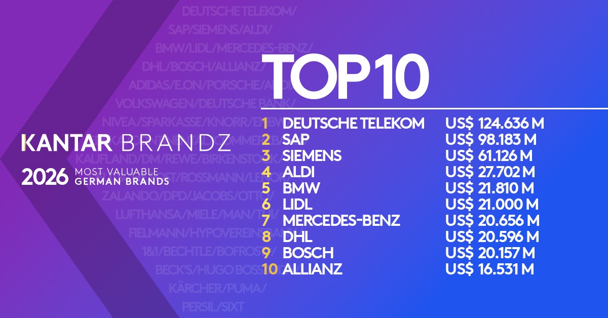 Deutsche Telekom has maintained its leading position for the fourth year running, once again being the most valuable German brand. This is according to the BrandZ study "Top 50 Most Valuable German Brands" by Kantar, published today. The current brand value of Telekom amounts to 124.6 billion US dollars. This puts T brand well ahead of SAP, Siemens, Aldi, BMW, and Lidl. Compared to 2025 (USD 105.7 billion), the company's brand value has grown by approximately 18 percent. Since 2020 (USD 44.9 billion), it has increased by a remarkable 177.5 percent based on the study's findings.