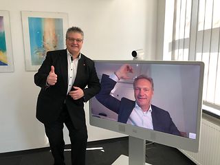 Instead of handshakes, elbow bumps – sealing a deal in the time of Corona: Dirk Backofen (left) with Christian Hentschel, President, Palo Alto Networks EMEA