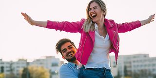 A man lifts his partner up. She stretches her arms wide open upwards.